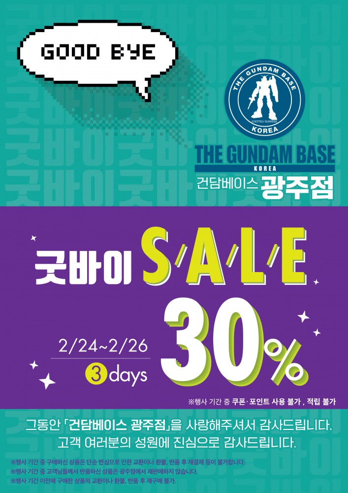 건담베이스 광주점이 2023년 2월 26일 영업을 종료합니다.