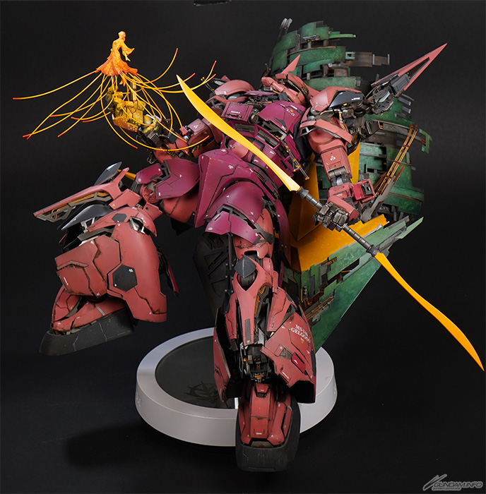 사랑이라는 주제를 어떻게 모형으로 표현하는가?라는 데서 구상에 착수했습니다.또 하나의 주제는 '샤아 전용 겔구그를 사용한다'는 것입니다.이 둘을 어떻게 융합시킬까 생각했을 때 기동전사 건담에서 라라아 슨이 자신을 희생해 샤아 아즈나블을 구하는 장면이 떠올랐습니다.이 장면을 모형으로 재현함으로써 사랑 때문에 사랑을 잃는 강렬한 감각을 표현하고 있습니다.