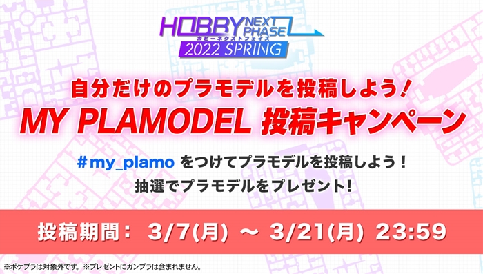 그리고「HOBBY NEXT PHASE 2022 SPRING」개최를 기념하여「MY PLAMODEL 업로드 캠페인」이 3월 7일(월)부터 스타트. 기간중에Twitter로 #my_plamo 를 태그하여 프라모델의 작품사진을 업로드 하면 추첨을 통해 프라모델을 경품으로 드립니다. 꼭 참가해 보세요~!