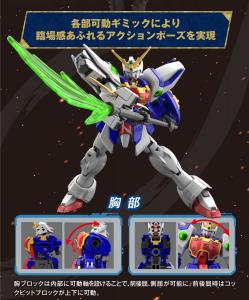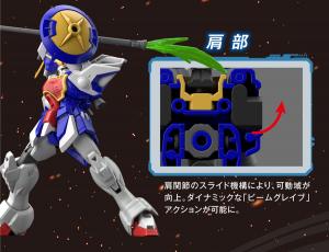 각 부분의 가동 기믹에 의해 임장감 넘치는 액션 포즈를 실현. 가슴 블록은 내부에 가동축을 탑재하여 앞뒤 가동과 측면가동이 가능하고 앞뒤 가동시에는 콕 피트 블록이 상하로 가동합니다. 또한 어깨관절의 슬라이드 기구에 의해 가동영역이 향상하여 다이나믹한「빔 그레이브」액션이 가능합니다.