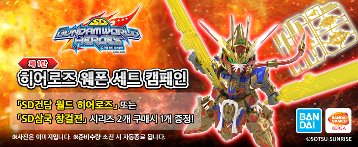 'SD건담 월드 히어로즈'와 'SD 삼국 창걸전' 시리즈의 중 2개 상품을 살 때마다 '히어로즈 무기 세트'를 무료로 드립니다!