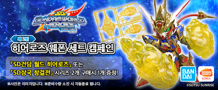 'SD건담 월드 히어로즈'와 'SD 삼국 창걸전' 시리즈의 중 2개 상품을 살 때마다 '히어로즈 무기 세트'를 무료로 드립니다!